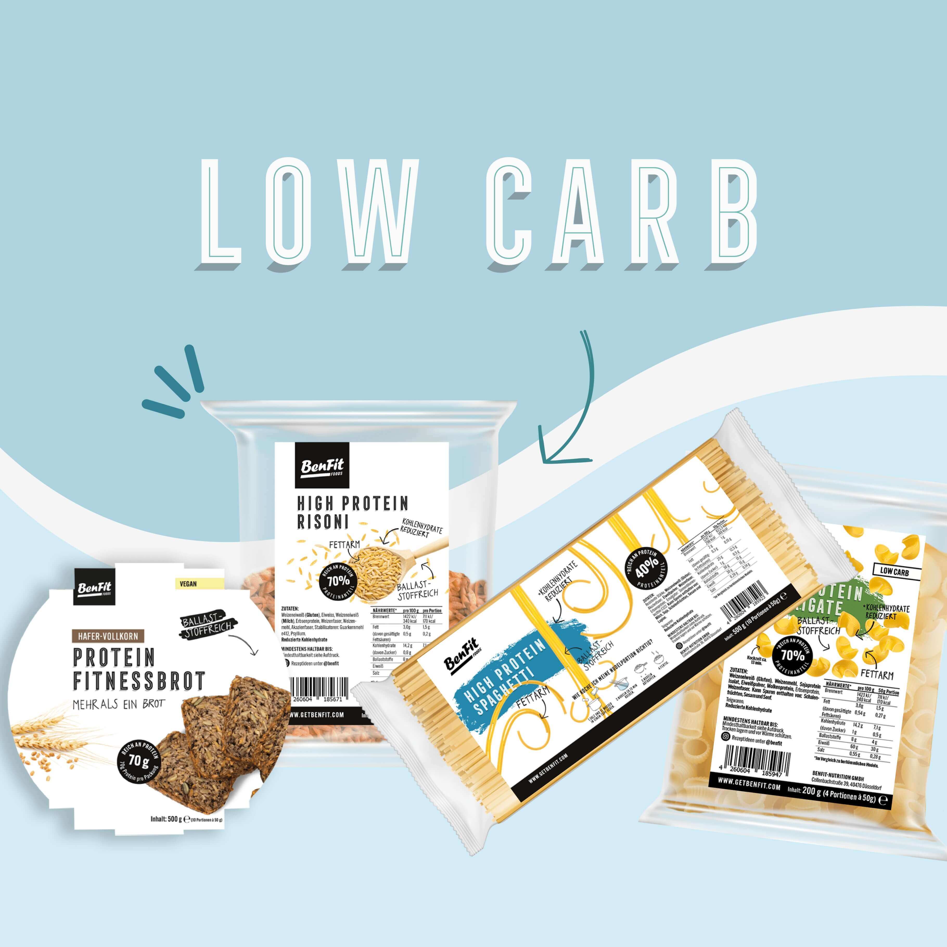 Unsere BenFit Pasta ist nicht nur reich an hochwertigem Protein, sondern auch low carb und kalorienarm, perfekt für alle, die eine gesunde, bewusste Ernährung lieben. Für alle, die die ketogene Diät bevorzugen, bieten wir unsere köstlichen Keto Fusilli – mit nur 5g Kohlenhydraten pro 100g und einem beeindruckenden 36g Eiweiß pro 100g. So kannst du deine Pasta ohne schlechtes Gewissen genießen und gleichzeitig deine Fitnessziele unterstützen.
